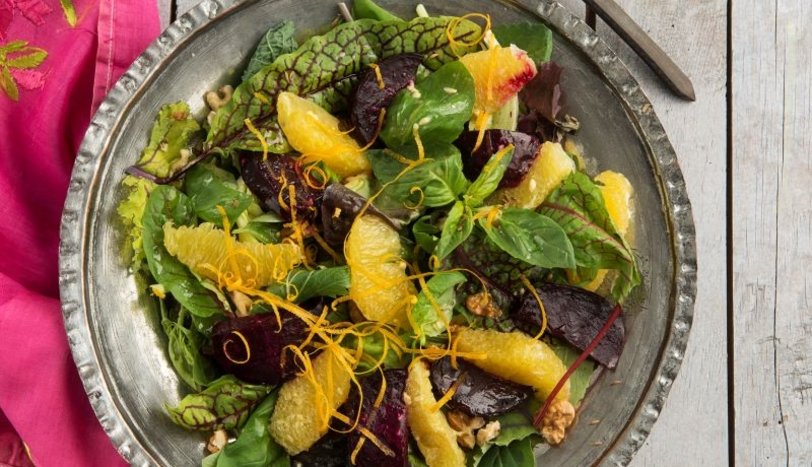 Maskolin yeşilliği ve ıspanağı sosla iyice karıştırıp servis tabağına alın. Üzerine pancar ve portakal dilimleri yerleştirin. Ceviz ve kimyon tohumu serperek servis yapın.