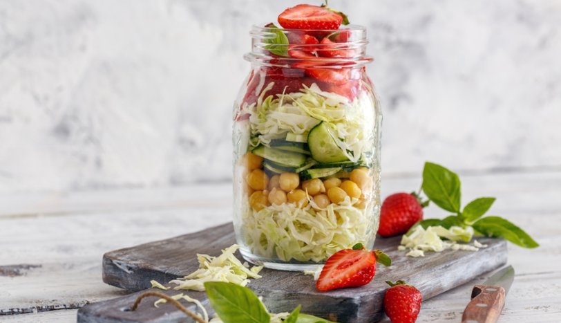 Kapağı sıkıca kapatılabilen bir kavanozun (500 gramlık kavanoz olmalı) içine sırasıyla lahananın yarısı haşlanmış nohut, dilimlenmiş salatalık, kalan lahana, ve çilek dilimlerini (birkaç yaprak fesleğen eklemeyi unutmayın) ekleyip kavanozun kapağını sıkıca kapatın.