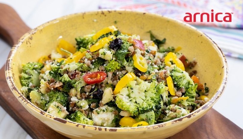 Brokoliyi ince kıyıp salata kasesine alın. Üzerine kıyılmış maydanoz, nane ve biber ekleyin. Arnica narenciye sıkacağı yardımı ile portakal ve limonunun suyunu sıkıp kabuğunu rendeleyin.