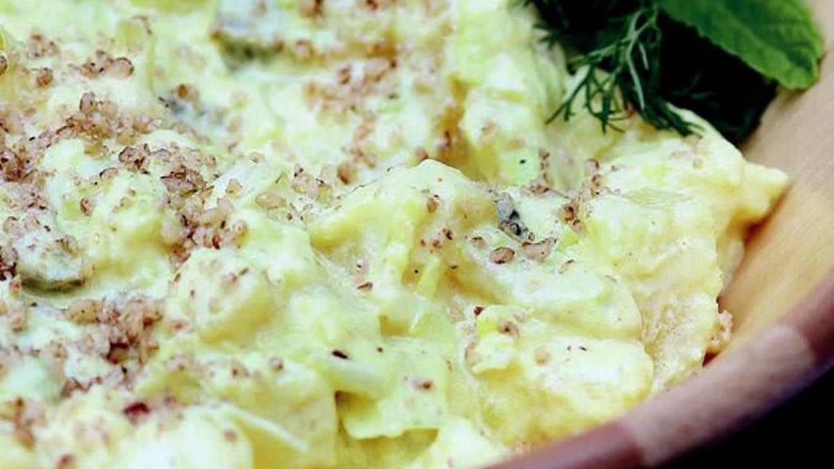 Pırasayı kıyın. Elma ve salatalıkların kabuklarını soymadan, irice küp doğrayın. Patates, pırasa, elma ve salatalığı derin bir kaseye alın.