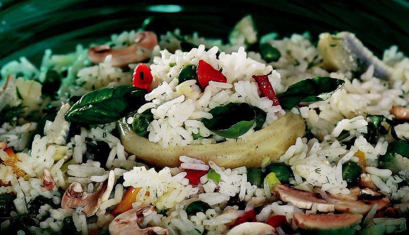 10 dakika demlendikten sonra bir kaseye alın. İçine iri doğranmış enginar, mantar, ince kıyılmış dereotu, taze soğan, fesleğen, küp doğranmış kırmızı ve sarı biber, bezelye katın. Kalan zeytinyağı ve limon suyunu ilave ederek bütün malzemeyi karıştırın. Üzerini kiraz domatesle süsleyerek soğuk servis yapın. - 2