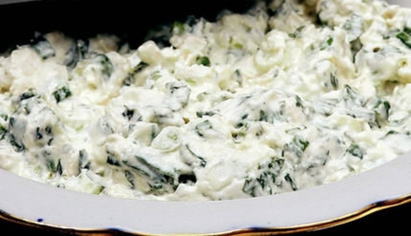 Eti şerit şeklinde doğrayın. Yoğurtlu karışıma ekleyip karıştırın. İnce kıyılmış taze soğan ile süsleyin. Buzdolabında yarım saat bekletip servis yapın.