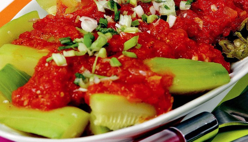 Sos için domatesleri, soğan ve sarımsağı rendeleyin. Zeytinyağı, sirke ve tuz ekleyip, domatesler eriyene dek pişirin. Haşlayıp irice doğradığınız biber ve kabakların üzerine bu sosu gezdirip servis yapın. - 2
