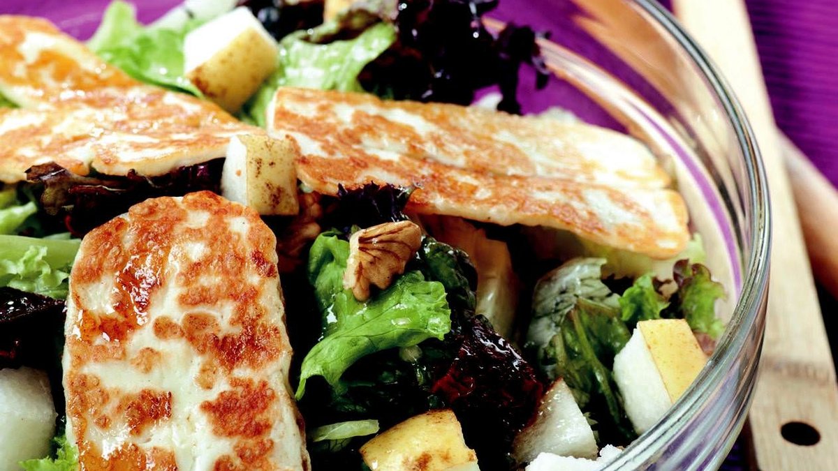 Salatanın üzerine kızarmış hellim peynirini yerleştirin. Sos için bir kapta zeytinyağı, limon suyu, nar ekşisi ve tuzu karıştırın. Salatanın üzerine gezdirip, tatların birbirine geçmesi için harmanlayıp, servis yapın.