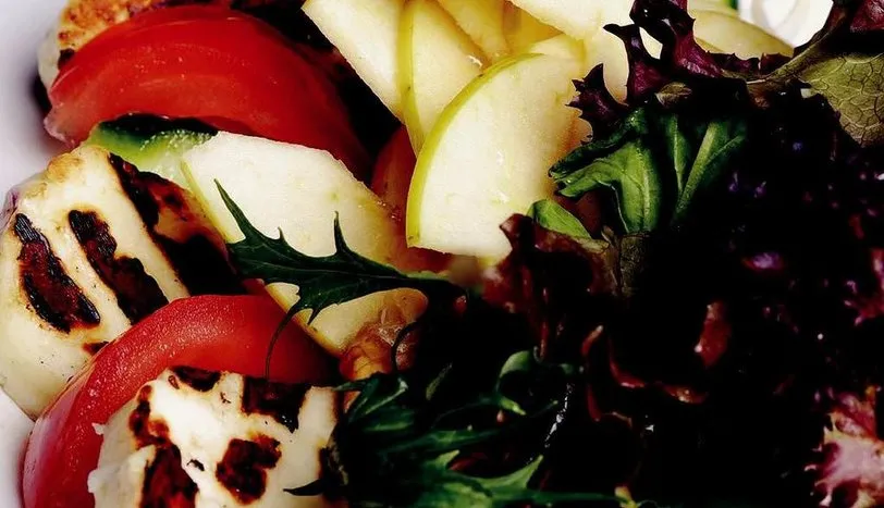 Akdeniz yeşilliğini servis tabağına alın. Dilimlenmiş salatalık, domates, elma ve jülyen doğranmış havucu tabağın kenarına yerleştirin. Üzerine cevizleri serpiştirin. Hellim peynirlerini ızgarada önlü arkalı kızartıp, salataya ekleyin. Zeytinyağı gezdirip servis yapın