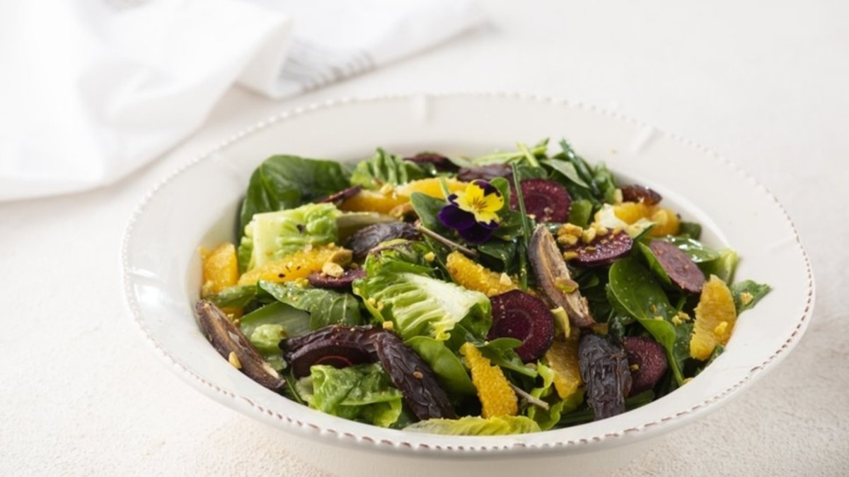 Sos için malzemenin tümünü karıştırın. Salatanın üzerine gezdirip harmanlayın ve yenilebilir çiçeklerle süsleyip servis yapın.