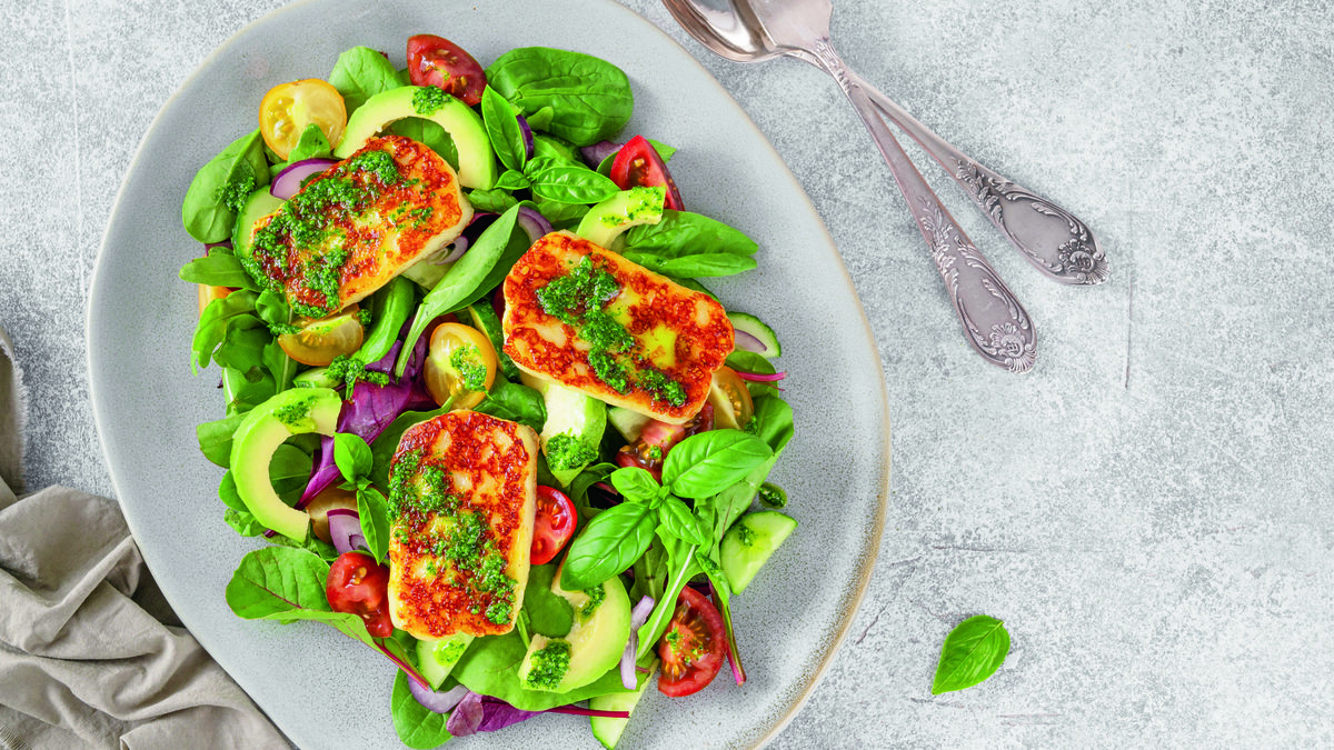 Büyük bir salata kasesine iri parçalar halinde doğranmış yeşillikleri alın. Üzerine avokado dilimlerini ve kiraz domatesleri ekleyin. Izgara hellim dilimlerini yerleştirin. Son olarak hazırladığınız fesleğenli sosu gezdirin. Hafifçe karıştırarak servis yapın.