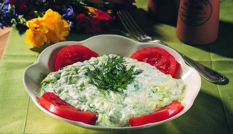 Kabakları rendeleyin. Tavaya zeytinyağını aktarıp rendelenmiş kabağı 2-3 dakika kavurun. Ocaktan indirip üzerine mayonez, süzme yoğurt, ince kıyılmış dereotu ve tuzu ekleyip karıştırın. Salatayı servis tabağına aktarıp, dilimlenmiş domateslerle süsleyin. Servis yapın.