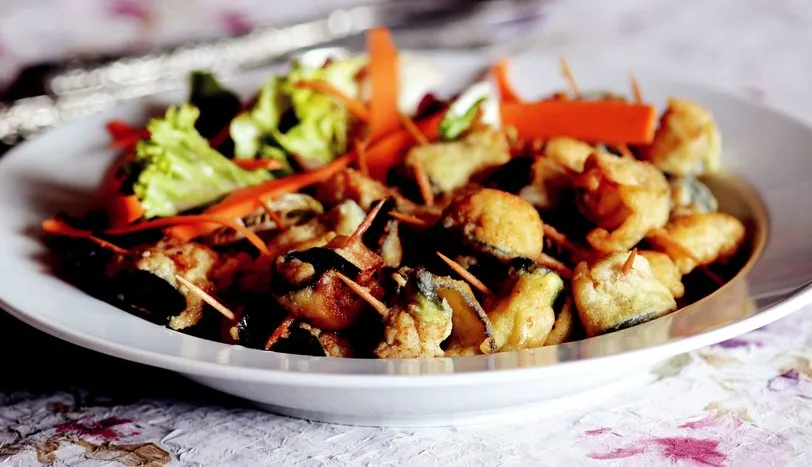 Patlıcanı boyuna ince şeritler halinde dilimleyip süte yatırın. Sütte bir miktar dinlenen patlıcanlara karidesleri sararak kürdan ile tutturun. Karidesleri sardığınız patlıcanları tekrar 15 dakika süte yatırın. Daha sonra sütten çıkarıp mısır ununa bulayarak sıvı yağda kızartın. Diğer taraftan sos için; bir kapta mayonezi, zeytinyağını, sirkeyi tuzu ve karabiberi karıştırın. Bu karışımı mevsim yeşilliğinin üzerine gezdirin. Kızarttığınız karidesli patlıcan rulolarını da salatanın üzerine ilave ederek servis yapın.