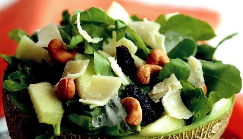 Kavunu ikiye kesin ve çekirdeklerini temizleyin. İçini bir kaşıkla çıkarın. Yıkanmış rokayı ince kıyın ve kavunların içine paylaştırın. Kıyılmış ya da rendelenmiş parmesan peynirini rokanın üzerine serpin. Kaju fıstıkları ve kuru üzümü pay edin. Çıkardığınız kavun parçalarını dilimleyip salataya katın. Zeytinyağı ve limon suyunu bir kapta karıştırıp, salatanın üzerine gezdirerek servis yapın