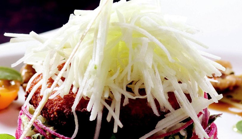 Roka ve Akdeniz yeşilliğini yıkayıp kuruladıktan sonra incecik kıyın. Vinaigrette sos ekleyip karıştırın ve servis tabağının ortasına oturttuğunuz çemberin içine bastırarak yerleştirin. Ayrı bir yerde keçi peyniri, un, yumurta ve galeta ununu karıştırıp sıvı yağda kızartın. Çemberdeki yeşilliğin üzerine koyun. İncecik jülyen doğranmış elmayı peynirin üzerine dizin. Domates, semizotu, ceviz ve turpları da yerleştirin. Hardal ve nar ekşisi gezdirip servis yapınAŞÇININ NOTUÖzelikle yeşil salatalarda kullanılan, sirke, sıvıyağ ve çeşitli baharat karışımlarından oluşan vinaigrette sosu marketlerden temin edebilirsiniz.