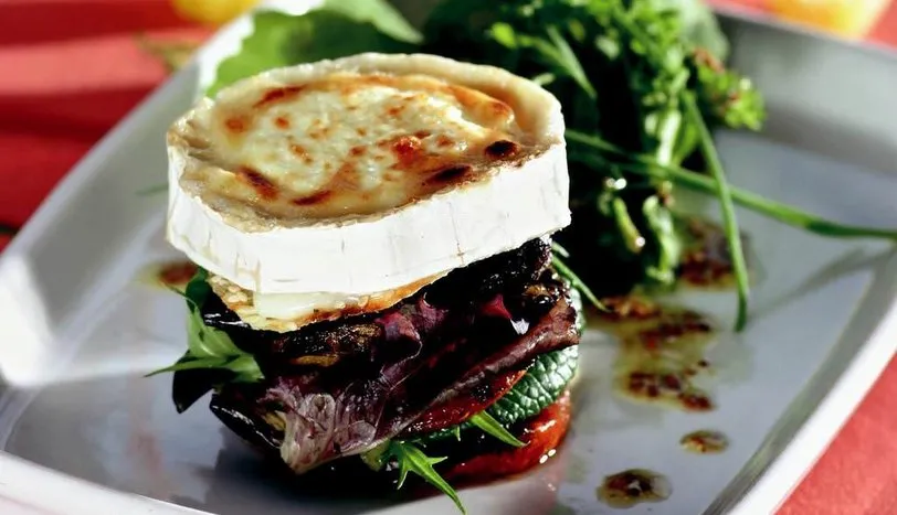 Domates, kabak ve patlıcan dilimlerinin üzerine, zeytinyağı, tuz ve kekik karışımından gezdirip, fırın ya da ızgarada pişirin. Sebzeler soğuyunca yuvarlak bir kabın içine, kat kat aralarına yeşillik koyarak yerleştirin. Servis tabağına kabı ters çevirip çıkarın. Üzerine kızartılmış keçi peynirini yerleştirin. Sosu için hardal ve zeytinyağını karıştırın. Salatanın üzerine gezdirip servis yapın.