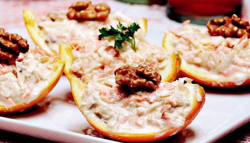 Kerevizleri temizleyip, rendenin kalın tarafıyla rendeleyin. Bir servis kabına alıp, üzerine limon suyunu gezdirin. Havuçların kabuğunu soyduktan sonra, rendenin kalın tarafıyla rendeleyin ve kerevize ilave edin. Yoğurt ve mayonezi ayrı bir yerde çırpıp üzerine ceviz ve tuz ekleyin. Mayonezli karışımı kerevize ekleyip karıştırın. Portakalları dörde bölün. İçlerindeki etli kısmı bir bıçakla kesip çıkarın. Hazırladığınız salatayı portakal dilimlerine paylaştırıp servis tabağına yerleştirin. Üzerine ceviz koyarak servis yapın.