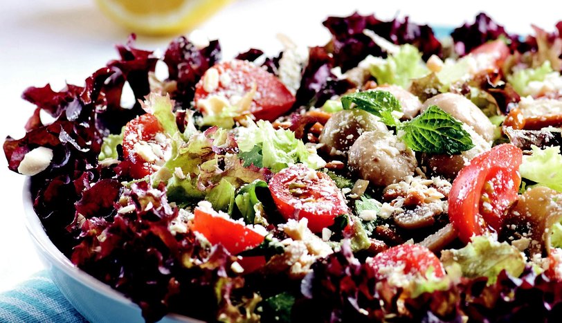 Yıkanmış ve suyu süzülmüş lollorossoyu elinizle iri parçalar halinde koparın ve servis tabağına alın. Üzerine tere, nane ve mantar ilave edin. Dörde bölünmüş kiraz domates ve dolmalık fıstığı da ekledikten sonra üzerine tereyağında kavrulmuş keşi serpin. Sos için zeytinyağı, limon suyu ve sirkeyi bir kasede karıştırıp, salatanın üzerine gezdirerek servis yapın.