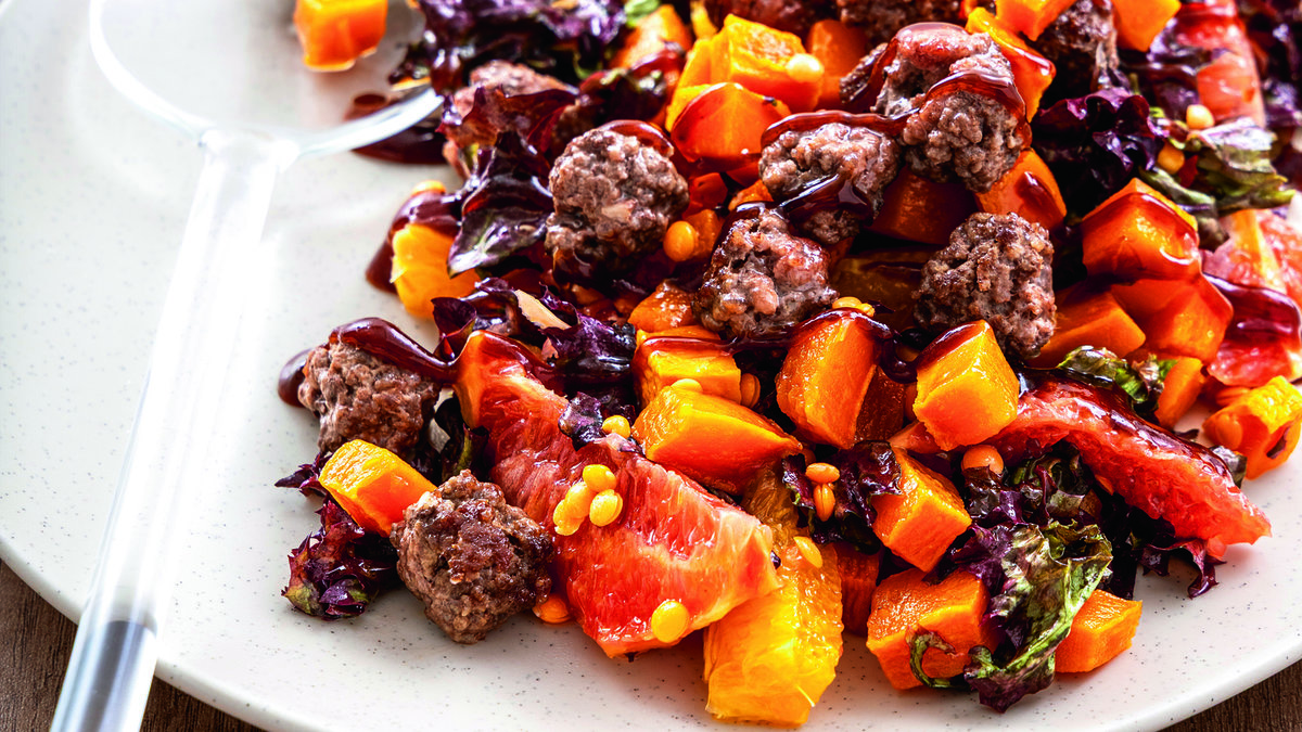 Yapışmaz yüzeyli bir tavaya pastırmaları dizin. Önlü arkalı 2-3 dakika pişirin. Kırmızı marulu iri parçalara bölerek servis tabağına alın. Üzerine haşlanmış mercimeği ve fırınlanmış bal kabağını ekleyin. Pastırmaları salatanın üzerine serpiştirin. Tuz, karabiber ve zeytinyağını gezdirerek salatayı harmanlayın. Köfteleri ilave ederek servis yapın.