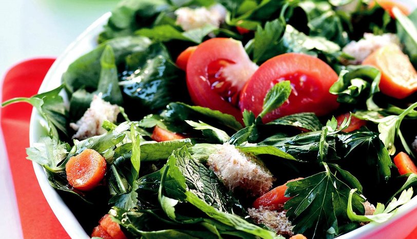 Köy ekmeğinin kabuk kısımlarını alın ve içini zar şeklinde doğrayın. Maydanoz, sapları ayıklanıp iri parçalara ayrılmış kuzu kulağı, nane, halka doğranmış havuç ve dilimlenmiş domatesi salata kasesine alıp, harmanlayın.