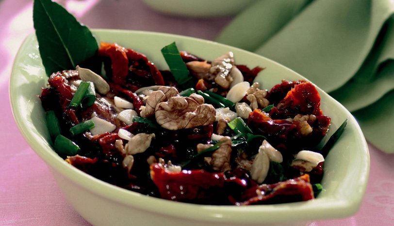 Kuru domatesleri sıcak suda 1 saat bekletin. Suyunu süzüp elinizle domatesleri tek tek hafifce sıkarak ayrı bir kaseye alın. İçine defne yaprağı, ince kıyılmış sarımsak, kekik, zeytinyağı, limon suyu, 4 ceviz, kakule, tuz ve karabiber ekleyip iyice karıştırın. Buzdolabında 1-2 saat bekletip servis yapın.