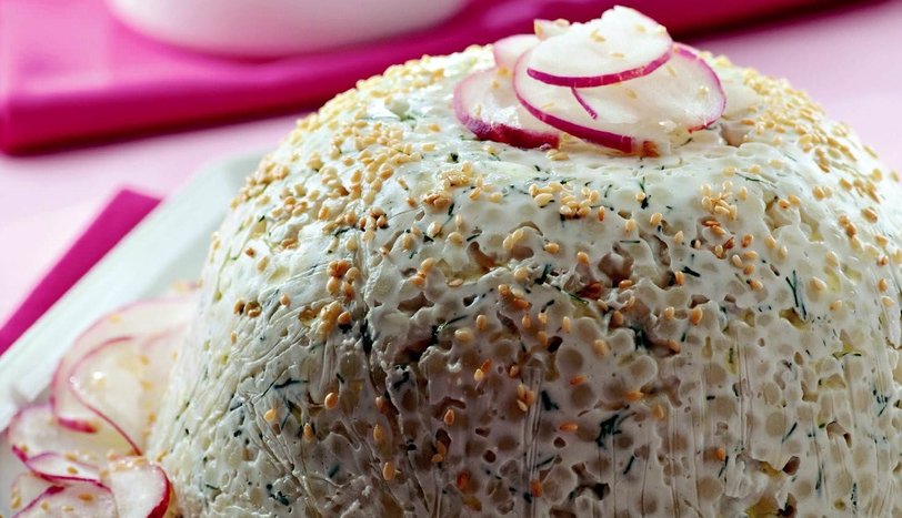 Dilediğiniz şekildeki bir kabı streç filmle kaplayın. Kuskusu yerleştirip, buzdolabında 1-2 saat dinlendirin. Servis tabağına ters çevirip çıkarın. Susamı zeytinyağında kavurup salatanın üzerine gezdirin. Soğuk olarak servis yapın.