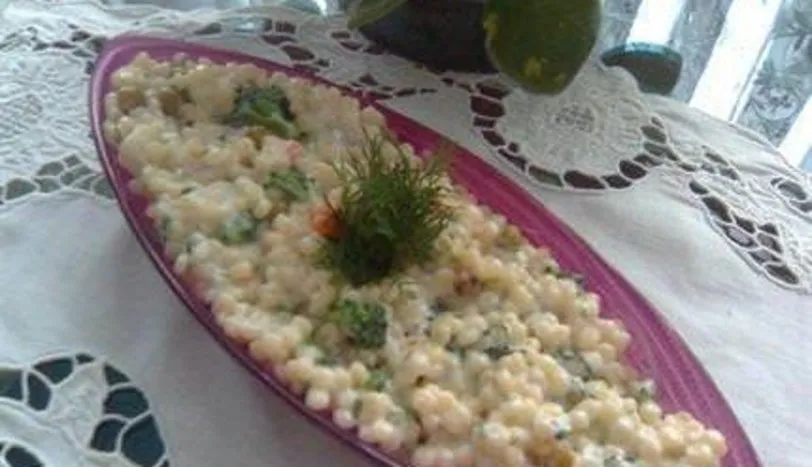 Kus kus makarnası haşlanıp süzülür. Derin bir kabın içine alınan kuskusun üzerine süzülmüş garnitür ve brokoliler eklenir. Üzerine yoğurt ve mayonez ile baharatlar eklenip dereotu da ince ince doğranır ve tüm malzeme fazla hırpalamadan harmanlanır. Servis tabağına alınıp afiyetle servis edilir ve afiyetle yenir.