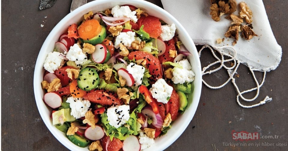 Jülyen doğranmış soğan ve kırmızı biberi katın. Greyfurtu temizleyip arzunuza göre dilimleyin ve üzerine ekleyin. Sos için limon suyu, greyfurt suyu, zeytinyağı ve tuzu karıştırıp salatanın üzerine gezdirin. Ardından lor ekleyin. Çörek otu ve ceviz serperek servis yapın