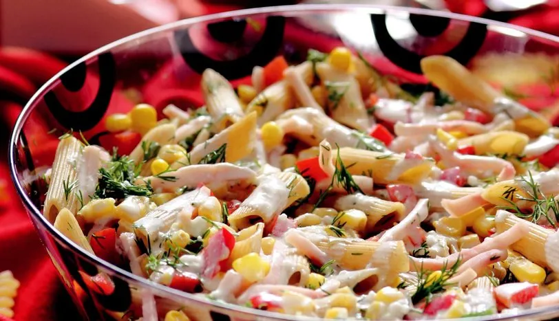 Haşlanmış makarnayı bir kaseye alın. İçine jambon, mısır, ince kıyılmış kırmızı biber ve dereotu ilave ederek bütün malzemeyi karıştırın. Sos için, bütün malzemeyi karıştırın. Hazırladığınız sosu salatanın üzerine gezdirip servis yapın.
