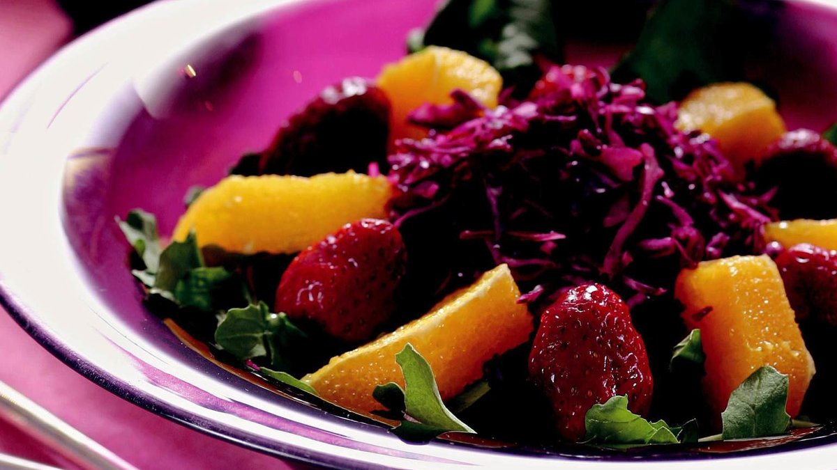Salatanın üzerine bir portakal dilimi bir çilek olacak şekilde dizin. Sos için, portakal suyu, elma sirkesi, beyaz biber ve tuzu karıştırın. Salatanın üzerine gezdirip servis yapın.
