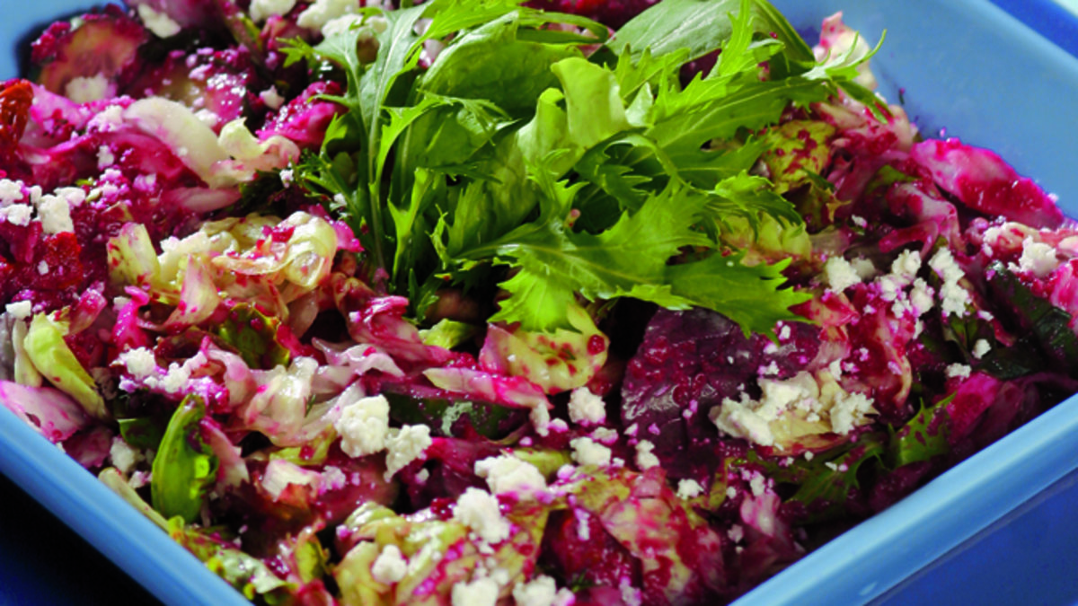 20 dakika suda beklettiğiniz kuru üzümler ve ince ince kıydığınız dereotu ile beraber bütün malzemeyi salataya katarak harmanlayın. Sos için dörde böldüğünüz pancar turşusunu, pancar suyunu, light yoğurdu ve zeytinyağını blender'den geçirin.