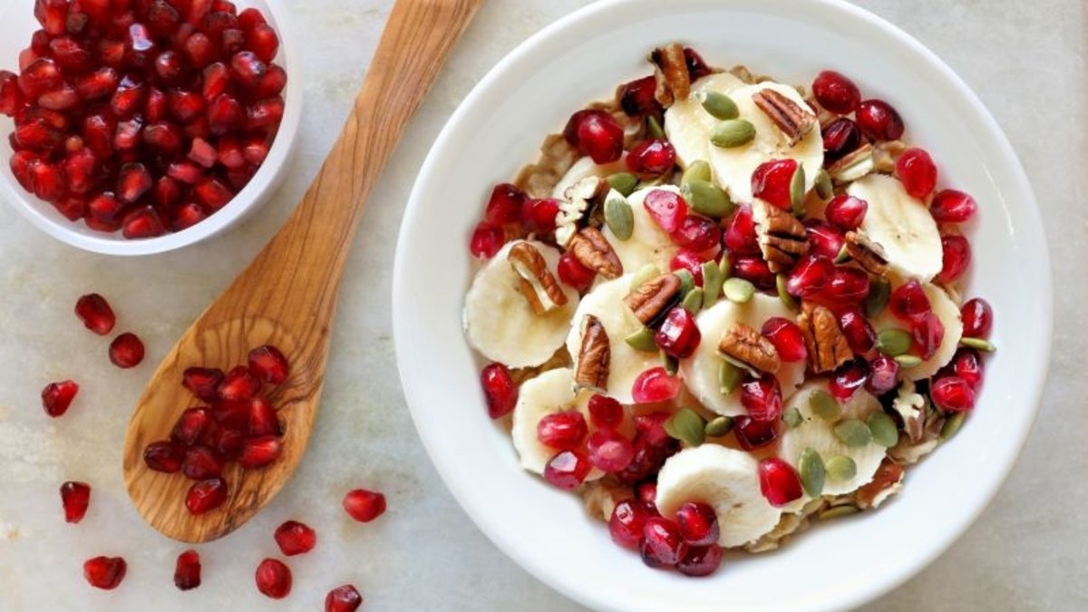 Salata kasesine nar tanelerini, kabak çekirdeği içini ve irice doğranmış pikan cevizini alın. Muz, bal ve tarçın ilave ederek tüm malzemeleri harmanlayın