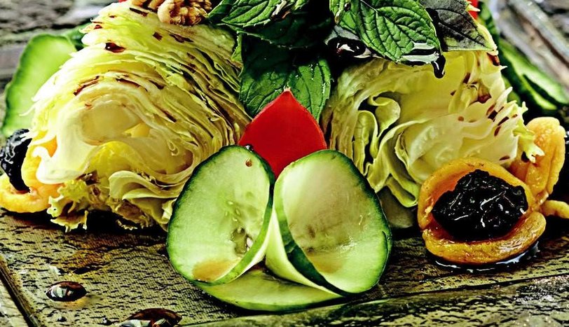 Kayısı ve erikleri 10 dakika sıcak suda bekletin. Eriklerin çekirdeklerini çıkarın ve her kayısının içine bir adet erik koyun. Göbek marulu iri doğrayıp servis tabağına alın. İri doğranmış domates ve salatalığı üzerine ekleyin. Erikli kayısı, ceviz, dereotu, maydanoz, nane ve fesleğenle süsleyin. Nar ekşisi, zeytinyağı ve tuzu küçük bi kapta karıştırıp salatanın üzerine gezdirdikten sonra servis yapın.