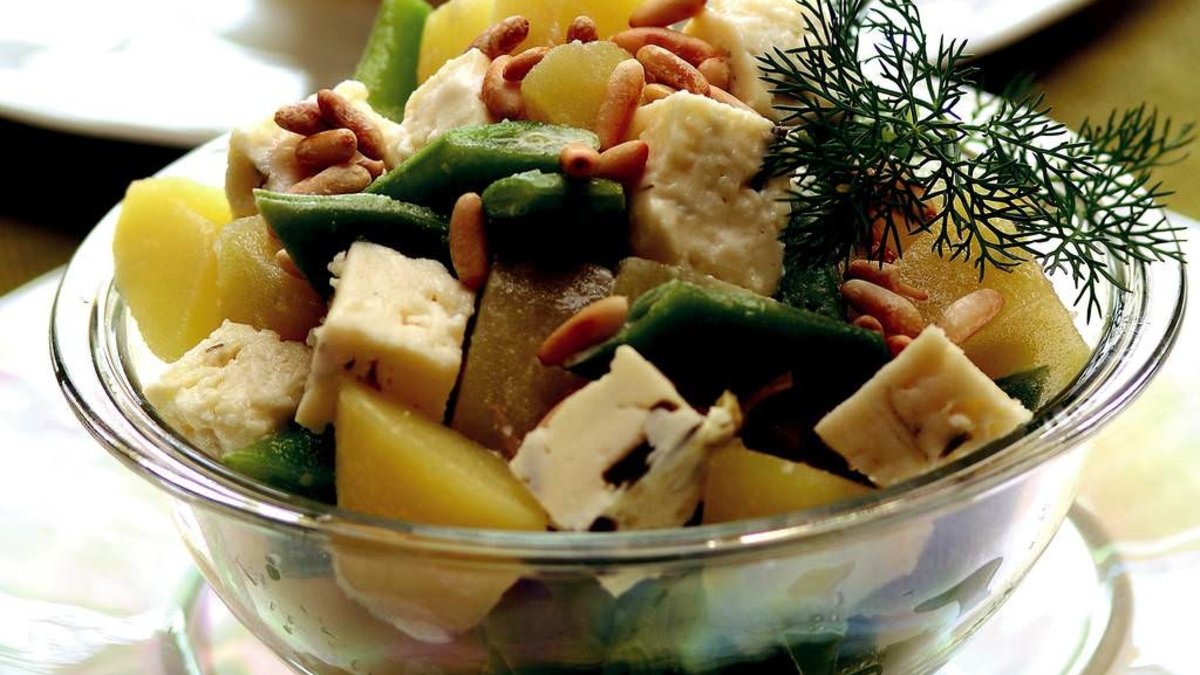 Üzerine verev doğramış fasulyeleri ve otlu peyniri ilave edin. Mayonez, limon suyu, ayçiçek yağ ve tuzu karıştırıp salatanın üzerine gezdirin. Dolmalık fıstığı serpin. Dereotu ile süsleyerek servis yapın.