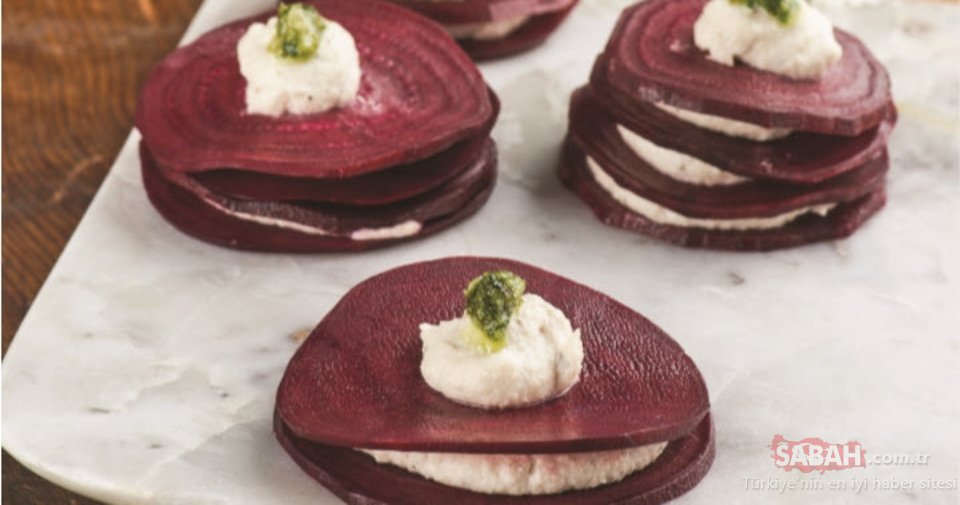 Pancarları mandolin yardımıyla dilimleyip, zeytinyağı ve tuz ile harmanlayın. Pişirme kağıdı kaplanmış tepsiye yerleştirip, yumuşayana dek dinlendirin. 1 adet pancar dilimini servis tabağına yerleştirin.
