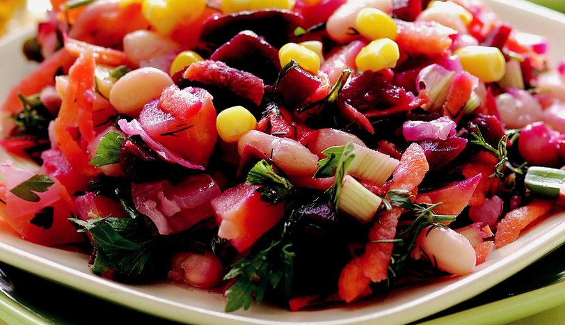 Kuru fasulyeleri akşamdan ıslatıp, sabah haşlayın. Pancar ve lahana turşusunu küçük doğrayın. Patatesleri haşlayıp küçük doğrayın ve havucu rendeleyin. Taze soğan, maydonoz ve dereotunu ince kıyıp, bütün malzemeleri karıştırın ve servis tabağına alın. Zeytinyağı, sirke ve tuzu bir bardakta karıştırın. Salatanın üzerine gezdirin. Mısır tanelerini en üste yayıp servis yapın.