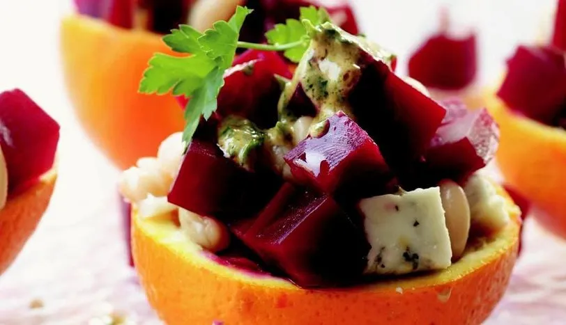 Portakalları ikiye bölün. Etli kısımlarını tamamen çıkarmadan içlerini düzgün şekilde oyun. Otlu peyniri küp doğrayıp bir kaba alın. Üzerine kuru fasulye ve kıyılmış maydanoz ilave edip karıştırın. Pancar turşusunu küçük küpler halinde doğrayın. Portakal çanaklarının içine biraz turşu koyun. Üzerine peynirli harçtan koyun. Yeniden turşu ve peynirli harç koyun. Sosu hazırlamak için tüm malzemeyi bir kaba alıp karıştırın. Pancarlı çanakların üzerine gezdirip servis yapın.
