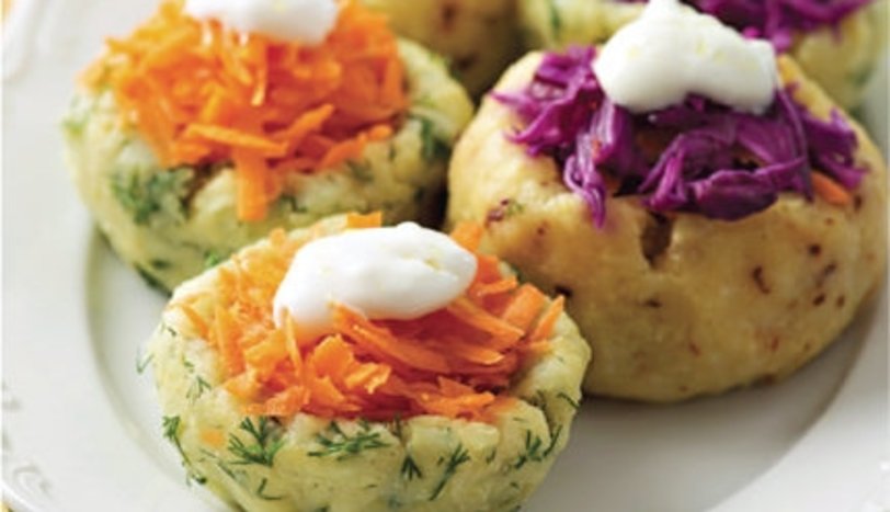 Patatesleri rendeleyip, zeytinyağı, karabiber ve tuzla iyice karıştırın. Daha sonra ikiye bölüp, bir kısmına pul biber, diğer kısmına kıyılmış dereotu ekleyin. Pul biberli patatesten elma büyüklüğünde parçalar koparıp, elinizde yuvarlayın. Başparmağınızla ortalarından çukur açın.