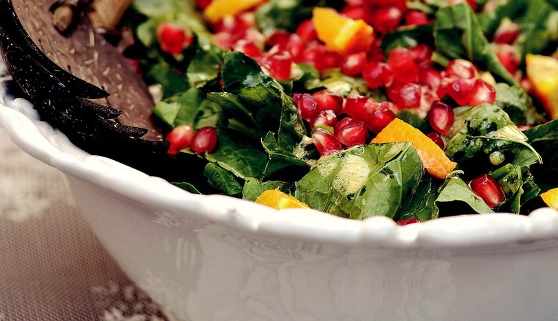 Pazı yapraklarını yıkayıp, salata kasesine alın. Üzerine kıyılmış taze soğan, nar tanesi, dilimlenmiş elma ve küçük doğranmış portakalı yerleştirin.