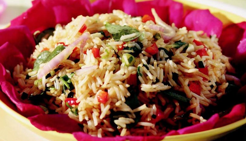 Basmati pirinci 2 çorba kaşığı zeytinyağında hafif kavurun. Tuz, karabiber ve suyu ilave edip, kısık ateşte pirinç yumuşayana kadar pişirin. Daha sonra 15 dakika demlenmeye bırakın. Demlendikten sonra geniş bir kaseye alın. İçine piyazlık doğranmış kırmızı soğan, sarımsak, küp doğranmış kırmızı biber ve ince kıyılmış taze kişnişi ilave edip karıştırın. Soya sosu, susam yağı, 2 çorba kaşığı zeytinyağı, kekik, limon suyu ve rendelenmiş kabuğu, köri ve semizotu yaprağını da ekledikten sonra bütün malzemeyi karıştırın. Tatların birbirine geçmesi için buzdolabında yarım saat beklettikten sonra servis yapın.
