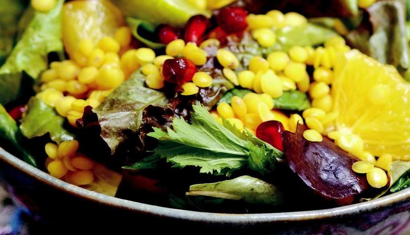 Mercimeği yıkayıp haşlayın. Süzüp kenara alın. Portakalların kabuklarını soyup küçük parçalar halinde doğrayın. Akdeniz yeşilliklerini yıkayıp servis tabağına alın. Üzerine, mercimek, portakal ve nar tanesi yerleştirin. Küçük bir kapta limon suyu ve zeytinyağını karıştırıp salatanın üzerine gezdirin. Tuzunu ayarlayın. Limon dilimleri ile süsleyerek servis yapın.