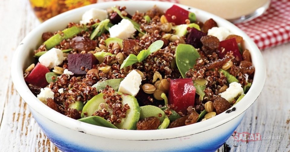 Kinoayı servis kabına alıp içine semizotu yaprakları, pancar, kabak, mercimek, kuruüzüm ve keçi peynirini katıp harmanlayın.