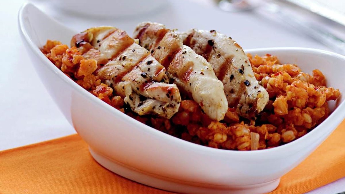 Buğdayı geceden ıslatıp, ertesi gün kendi suyuyla haşlayın. Suyunu süzüp, soğumaya bırakın. Tavuk etini dilimleyip, yarım kahve fincanı zeytinyağı, karabiber ve tuz karışımında 1 saat marine edin.