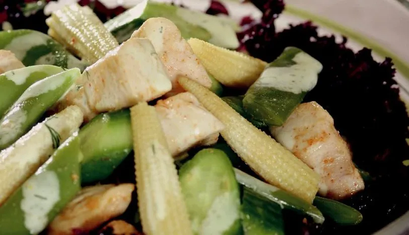 Fasulyeleri temizleyip yumuşayıncaya kadar haşlayın. Soğuk sudan geçirip verev olarak ikiye bölün ve geniş bir kaba alın. Sıvı yağı bir tavaya alıp toz kırmızıbiber ve tuz eklediğiniz tavuk etlerini pişirin. Tavuklar soğuduktan sonra fasulyelere ekleyin. Soyup verev doğradığınız salatalıkları da üzerine ekleyip harmanlayın. Geniş ve çukur bir salata tabağının tabanına elinizle iri parçalar halinde kopardığınız lollorossoları yerleştirin. Üzerine fasulyeli tavuklu karışımı ekleyin. Bebek mısırları yerleştirin. Bir sos kabında mayonez, hardal ve limon suyunu karıştırın. Üzerine ince kıyılmış dereotu, tuz ve karabiber ilave edin. Hazırladığınız sosu salatanın üzerine gezdirip servis yapın.