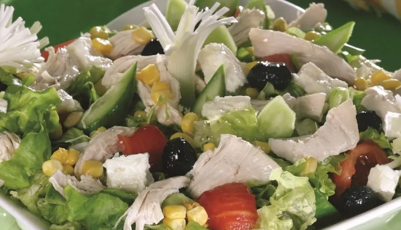 Tavuk göğsünü haşlayıp soğutun. Kıvırcıkları yıkayıp irice doğrayın ve salata kabına alın. Domateslerin kabuklarını soyup dörde böldükten sonra kıvırcıkların üzerine yerleştirin. Salatalıkları soymadan verev doğrayın ve salataya ekleyin. Tavuğu elinizle didikleyip salatanın üstüne serpiştirin. Peynir, zeytin ve mısırı da üzerine serpin. Sos için zeytinyağı ile diğer malzemeleri karıştırıp salatanın üstüne gezdirin. Soğanların beyaz kısımlarını üç parmak boyunda kesip her iki tarafından püskül yapın. Hazırladığınız soğanlarla salatayı süsleyip servis yapın.