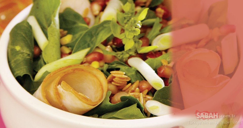 Ispanağı bol suda yıkayıp, kurulayın. Ispanak, roka, göbek salata ve taze soğanı kıyıp, salatalığı doğrayın. Daha sonra salata kasesine alıp, tuzunu ayarlayın. Arpa şehriyeyi zeytinyağında pembeleştirin. Suyu ilave edip haşlayın. Şehriye soğuyunca salatanın üzerine ekleyin. Dilimlenmiş hindi fümeyi ekleyip, nar tanelerini serpiştirin. Sosu hazırlamak için vişne, sirke ve zeytinyağını blenderden geçirin. Salatanın üzerine gezdirip servis yapın.