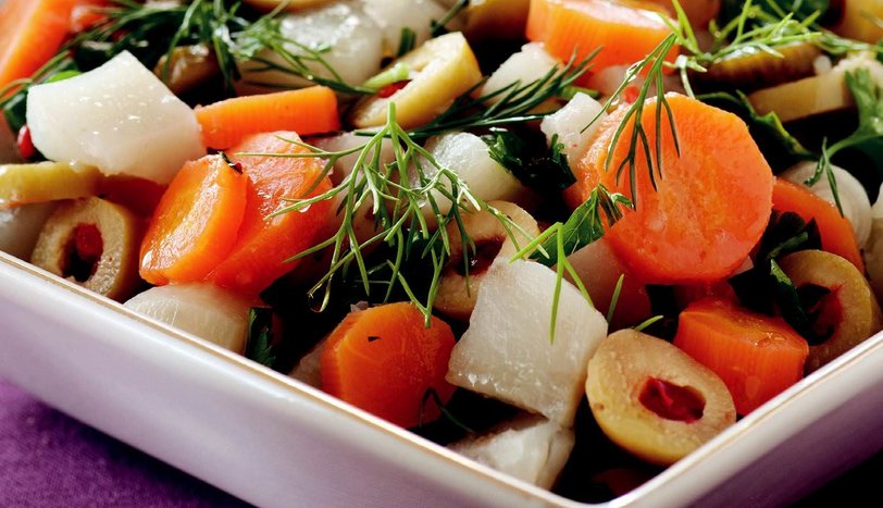 Kabukları soyulmuş yerelması ve havuçları buharda pişirin veya yumuşayana dek haşlayın. Soğuduktan sonra dilediğiniz şekilde doğrayın. Dilimlenmiş zeytin, salatalık turşusu, kıyılmış soğan ve maydanoz ilave edip harmanlayın. Sos için, limon suyu, zeytinyağı ve tuzu karıştırın. Salatanın üzerine gezdirip servis yapın.