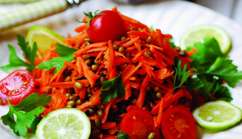 Maş fasulyesini tencereye alın. Üzerine 3 su bardağı su ekleyip haşlayın. Fazla suyunu süzün. Havucu rendeleyin. Maydanozun yapraklarını ayıklayın. Rendelenmiş havuç, maydanoz yaprakları ve haşlanmış maş fasulyesini karıştırıp servis tabağına alın. Üzerine limon suyu gezdirin. Kiraz domateslerle süsleyip servis yapın.