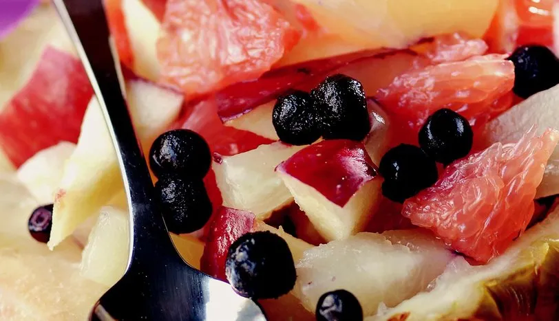 Ananası boylamasına keserek içini temizleyin. Ananasın içinden çıkan meyvesini, portakalı ve elmayı küp şeklinde doğrayarak karıştırın. Meyve karışımını ananasın içine yerleştirin. Şurubu için, ananas suyunu, limonun suyunu, toz şekeri ve brandy'i karıştırıp meyve salatasının üzerine gezdirin. Buzdolabında yarım saat dinlendirin. Çıkardığınızda üzerine yaban mersini serpiştirip servis yapın.