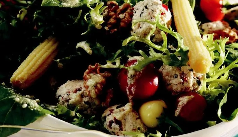 Kıvırcığın yapraklarını elinizle ayırarak salata kasesine yerleştirin. Domates, bebek mısır, fesleğen, kıyılmış kokteyl zeytin ve cevizi ilave edin. Peynir topları için; fesleğen, nane, lor peyniri ve kıyılmış kırmızı biberi iyice karıştırın. Elinizde yuvarlayıp, kaseye yerleştirin. Sosu için, zeytinyağı, krem peynir ve limon suyunu iyice çırpın. Salatanın üzerine gezdirip, servis yapın.