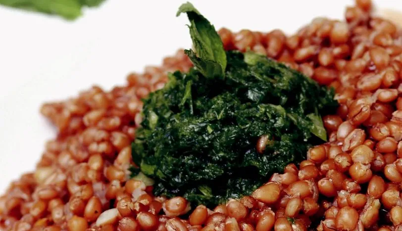 Buğdayı, bir gece soğuk suda bekletin. Ertesi gün üzerini iki parmak geçecek kadar su ile haşlanmaya bırakın. Buğday suyu çekince, kaynamış suyu ekleyin. Buğdayın cinsine göre haşlama süresi 30-45 dakika arasında değişebilir. Haşlamanın sonunda, buğday suyu tamamen çekmiş olmalıdır. Derin bir kaba alınan haşlanmış buğdayın üzerine, sıcakken nar ekşisi gezdirin. Buğday soğurken, ince kıyılmış soğan, nane, maydanoz ve zeytinyağını blenderde çekerek yeşil sos hazırlayın. Bu karışımı, buğday salatasına ilave edin. Üzerine bir kez daha nar ekşisi gezdirerek servis yapın.