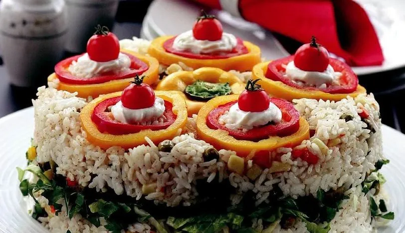 Pirince su ekleyip, diri kalacak şekilde haşlayın. Fazla suyunu süzüp, sıvıyağ, tuz, karabiber ve kimyon ilave edip karıştırın. Garnitürü ekleyip, harmanlayın. Pirinci ocaktan alıp, yarısını kelepçeli kalıba dökün. Üzerini kaşıkla düzeltip, dilimlenmiş salatalık turşularını yerleştirin. Ayrı bir yerde dereotu, maydanoz, taze soğan ve marulu karıştırıp, pirincin üzerine yayın. Yoğurt ile mayonezi karıştırıp, yarısını yeşilliklerin üzerine sürün. Pirincin kalan yarısını da kalıba döküp, üzerini kaşık yardımıyla düzeltin. Kırmızı ve sarı biberi halka şeklinde doğrayıp, pirincin üzerine yerleştirin. Ortalarına kalan mayonezli yoğurt karışımını yerleştirip servis yapın.