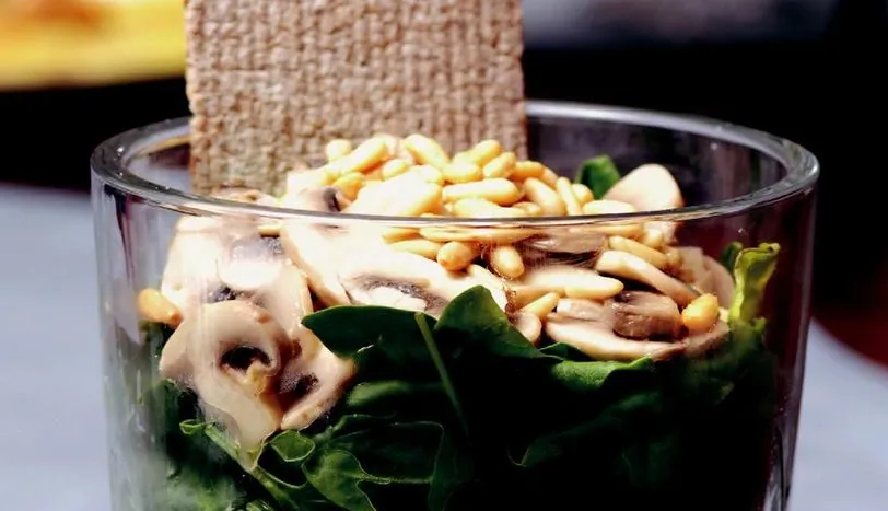 Zeytinyağı, limon, tuz ve karabiberi karıştırıp sos hazırlayın. Ispanağı yıkayıp kurutun ve sos ile karıştırın. Mantarları temizleyin. Dilimleyip, sıvı yağda kavurun. Tuz ve karabiber ile tatlandırılan mantarları, ıspanakların üzerine yerleştirin. Dolmalık fıstıkları 1 çorba kaşığı tereyağı ile kavurup, mantarların üzerine serpin.