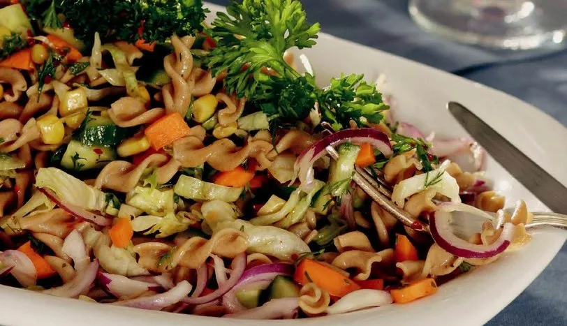 Makarnayı haşlayıp süzün ve ılınmaya bırakın. Soğanı piyazlık doğrayıp tuzla ovun. Havuç ve salatalığı temizleyip küp doğrayın. Göbek marul ve maydanozu ince kıyın. Domatesleri ikiye bölün. Makarnayı servis tabağına alıp, üzerine doğradığınız sebzeleri ve mısırı ilave edin. Tüm malzemeyi karıştırıp sosu hazırladıktan sonra, salatanın üzerine gezdirin. İyice karıştırıp servis yapın.